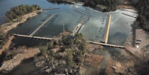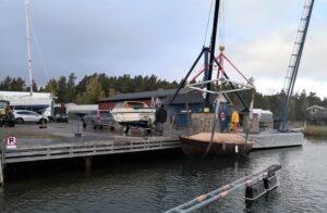Just nu pågår ett viktigt underhållsarbete vid kranbryggan vid varvet. I det låga vattenståndet på minus 70 cm passar man på att åtgärda och byta bärande balkar.